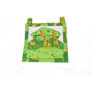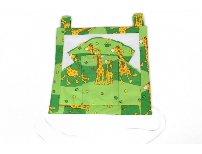 Vreckár na detskú postieľku žirafa zelená, päť priestranných vreciek, štyri na prednej strane + 2 kapsičky na cumlík a iné drobnosti, jedno veľké vrecko na zadnej strane - zapínanie na suchý zips (vhodná na plienky, ...)